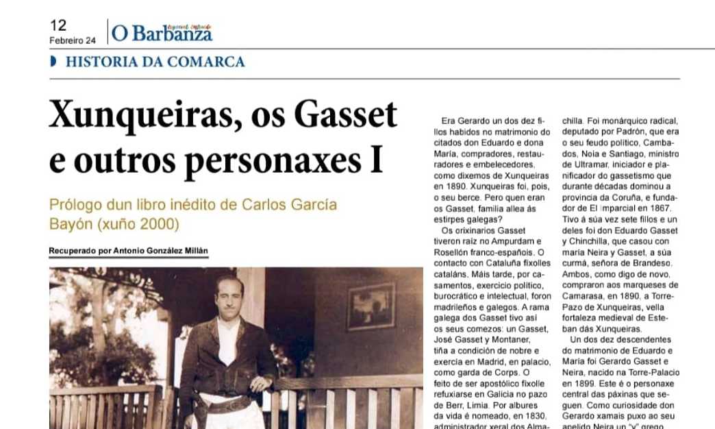 Compartimos la colaboración publicada en el diario 'O Barbanza', ediciones impresas de los números correspondientes a los meses de marzo y abril. Se trata del texto inédito escrito por una figura referente del periodismo galego y de la literatura divulgativa interesada por la cultura: Carlos García Bayón 👉 páginas del prólogo titulado «Xunqueiras, los Gasset y otros personajes» (Xuño - Porto do Son, noviembre de 2000). Manuscrito e imágenes relativas al diplomático y escritor Gerardo Gasset Neyra conservadas en este Museo.